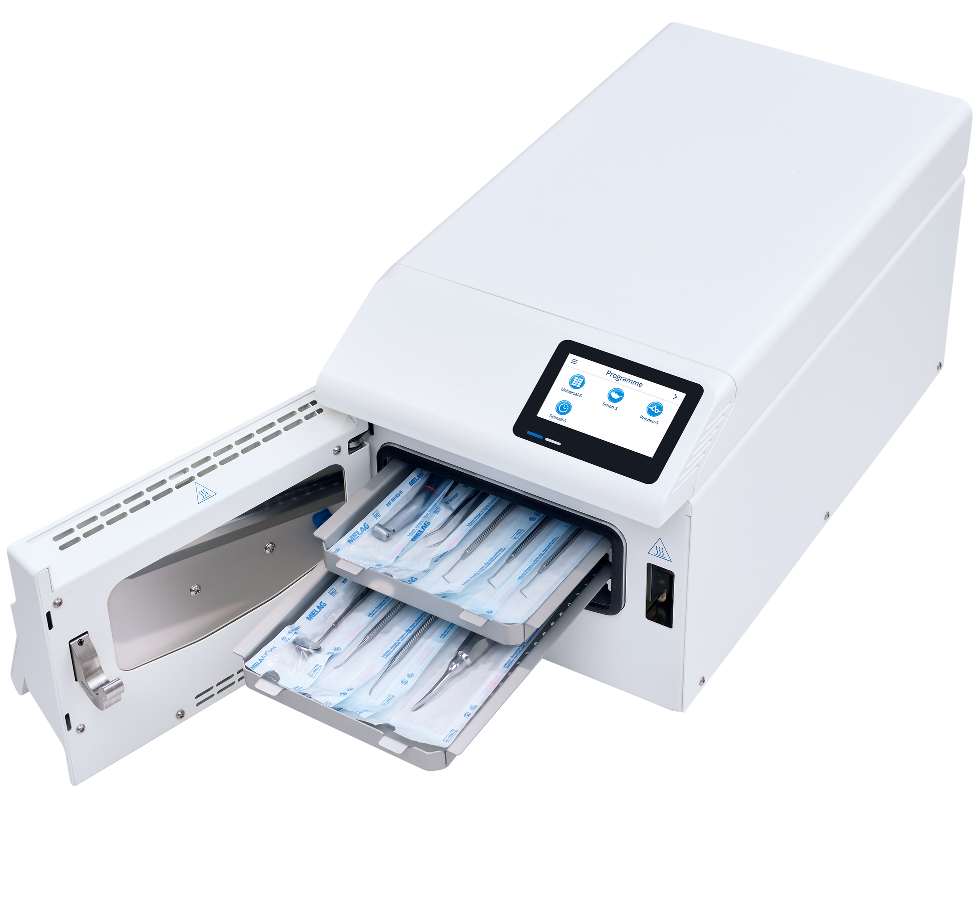 - Compliance with legal requirements through logging of sterilisation parameters via USB and network or log printout via MELAprint 80.